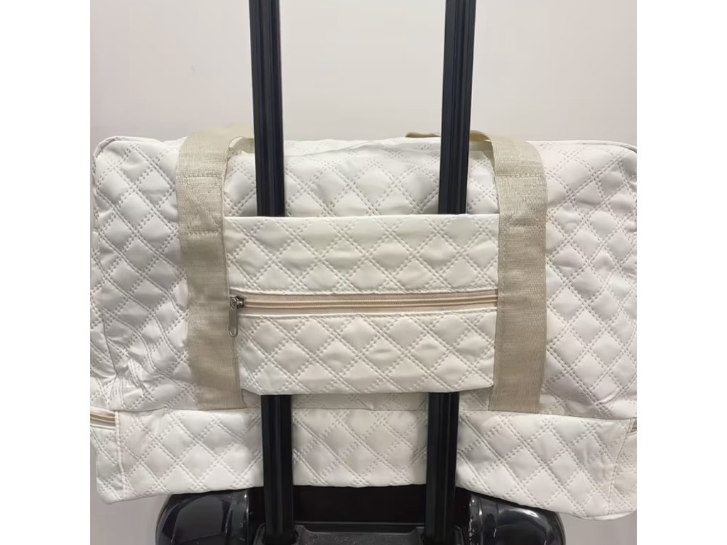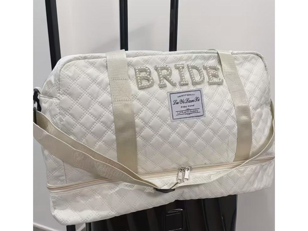 Prošívaná cestovní taška s nápisem Bride je ideální na svatební víkend, rozlučku se svobodou nebo svatební cestu. Elegantní krémový design se třpytivým nápisem působí něžně a slavnostně, ale zároveň je praktický na každodenní použití.