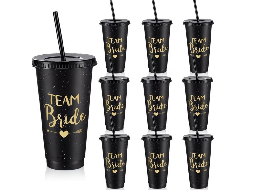 Stylové kelímky „Team Bride“ jsou perfektním doplňkem na rozlučku se svobodou, svatební víkend nebo holčičí party. Černý design se zlatým nápisem působí elegantně a skvěle vypadá na fotkách.