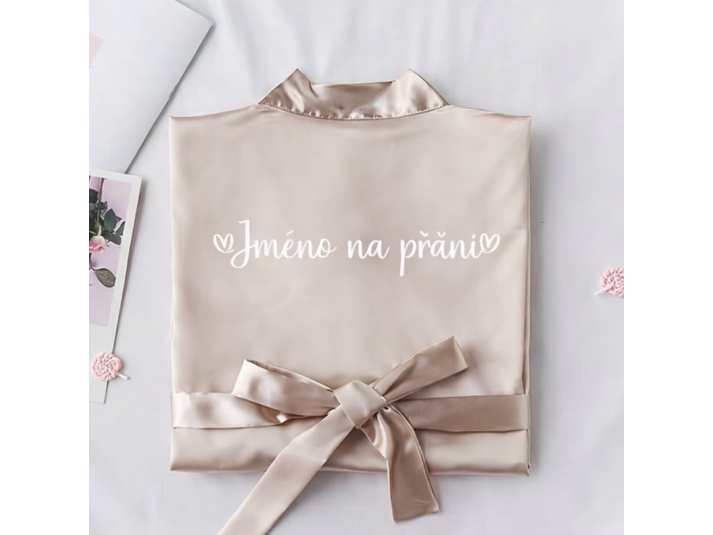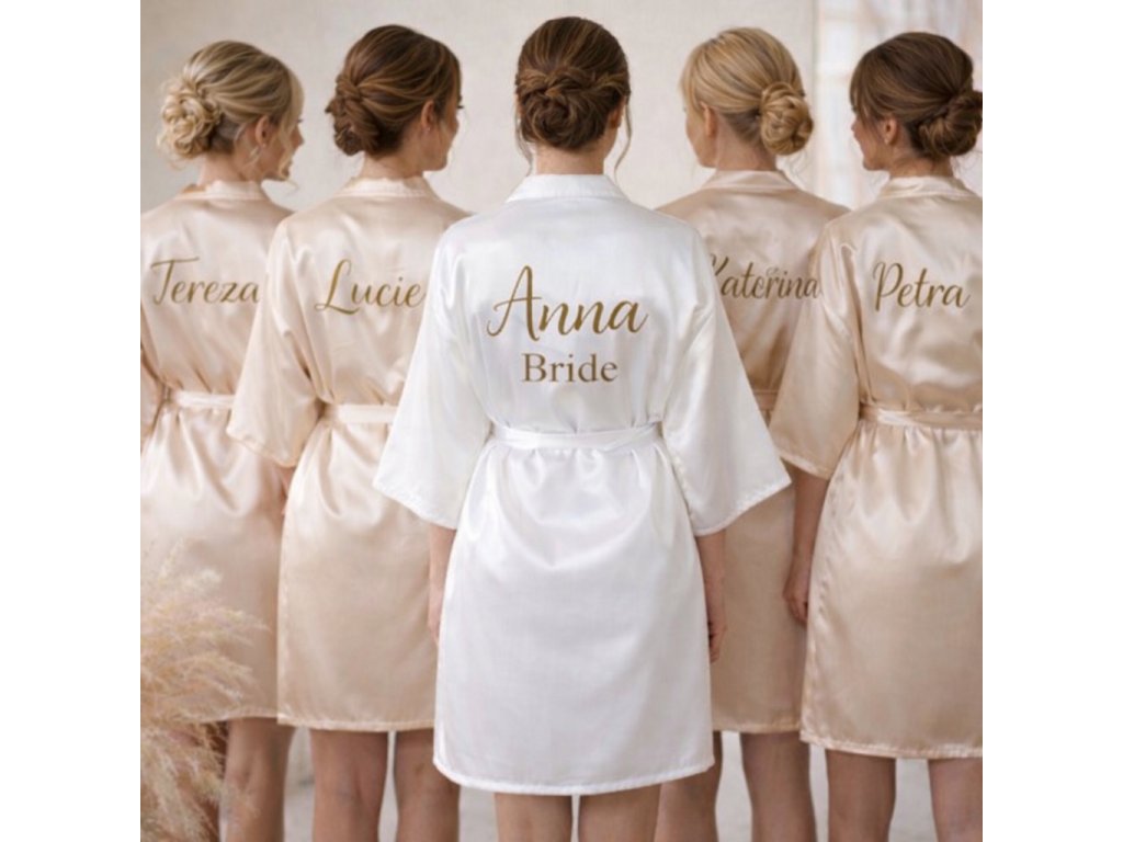 Stylové saténové župánky s vlastním potiskem jsou dokonalým doplňkem pro nevěstu i její tým během svatebních příprav. Elegantní lesklý materiál, pohodlný střih a personalizované jméno na zádech vytvoří nezapomenutelné ranní momenty i dokonalé fotografie.