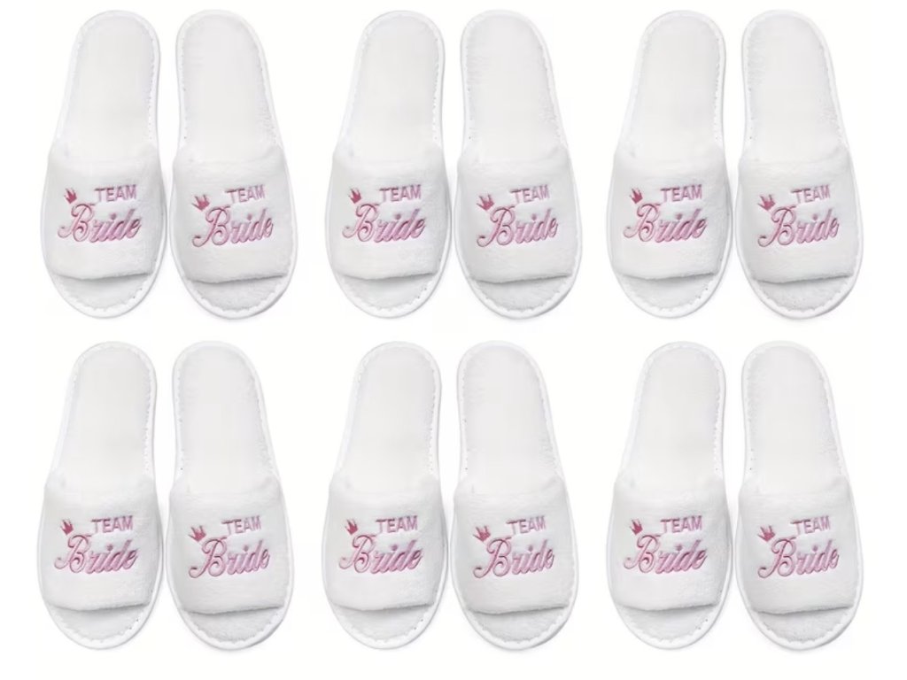 Hebké bílé pantofle s růžovým nápisem Team Bride jsou ideálním doplňkem pro rozlučku se svobodou, svatební ráno i přípravy nevěsty s družičkami. Pohodlné, měkké a stylové – perfektní pro sladěné fotografie i pohodlí během celého dne.